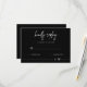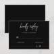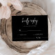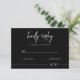 Invitez vos invités à répondre avec style avec cette élégante carte de réponse de mariage noire minimaliste. Caractérisée par un fond noir épuré, une écriture blanche moderne et une typographie claire, cette carte de réponse complète parfaitement les thèmes de mariage contemporains, black-tie ou monochromes. Personnalisez-la avec vos noms, la date de réponse et les options de repas pour un effet totalement personnalisé. Elle se marie parfaitement avec les invitations, les plans de table et la papeterie de mariage assortis pour un look cohérent. Imprimée sur du papier de qualité supérieure avec des enveloppes incluses, ce qui permet aux invités d'envoyer facilement leurs réponses.
