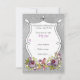 Cette carte de réponse de mariage florale à l'aquarelle violette, verte et blanche a une zone de texte dessinée à la main fantaisiste délimitée de noir avec des fleurs aquarellées variées dans différentes nuances de mauve, de bordeaux, de rose, de violet et de pêche avec des feuilles vert olive et jaune doré le long du bas de l'invitation qui sont également délimitées de noir. Le fond a l'apparence d'un faux foil argenté. Si vous avez besoin d'articles assortis dans ce design, ou si vous avez besoin d'aide pour le personnaliser avec vos informations, veuillez envoyer un courriel à niteowlstudio@gmail.com. ****VEUILLEZ NOTER que tout sera imprimé tel qu'il apparaît sur votre écran.