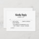 Planifiez votre jour spécial avec style grâce à nos cartes de réponse de mariage magnifiquement conçues. Avec un mélange parfait de simplicité et de modernité, ces cartes sont sûres d'impressionner vos invités. Conçues avec amour et attention aux détails, nos cartes de réponse ajouteront une touche d'élégance à votre papeterie de mariage. Ces cartes présentent un message "Réponse aimable" gras et accrocheur, composé dans une police élégante et sophistiquée. La conception claire et lisible permet des réponses rapides et sans tracas afin que vous puissiez gérer facilement votre liste d'invités et vous assurer que chaque réponse est prise en compte. Que vous organisiez une réunion intime ou une célébration somptueuse, ces cartes vous aideront à organiser votre mariage avec la plus grande efficacité. Prêt à faire une impression durable sur vos invités ? Commandez votre jeu de cartes de réponse dès aujourd'hui et découvrez la facilité et l'élégance qu