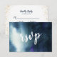 Carte de réponse élégante pour votre mariage sur le thème bleu marine et or ! Cette carte a un fond aquarelle peint à la main dans un dégradé de bleu marine. Il est écrit "rsvp" dans une police de caractères moderne. Au dos, il y a des paillettes dorées des deux côtés de la carte, et les invités peuvent écrire leur nom, le nombre de participants et leur choix de repas pour la réception. Les textes sont facilement personnalisables en ligne.