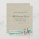 Invitation de mariage de plage rustique avec l'aspect romantique de la toile de jute et de la dentelle, accentuée par une étoile de mer et un ruban aqua.