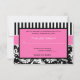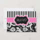 Cette carte de réponse moderne à rayures roses, noires et blanches avec damas floral correspond à l'invitation de mariage présentée ci-dessous. Le texte et le type de papier sont personnalisables. ****VEUILLEZ vous assurer que tout le texte est centré et dimensionné exactement comme vous le souhaitez, car il sera imprimé exactement comme vous le voyez sur votre écran. Je ne le verrai pas, et Zazzle ne modifiera rien, donc si vous avez besoin d'aide, veuillez m'envoyer un courriel AVANT de passer votre commande. Si vous avez besoin d'articles assortis, veuillez envoyer votre demande à niteowlstudio@gmail.com.