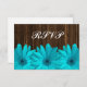 Une carte RSVP de mariage à thème country avec marguerites bleues turquoises sur un arrière - plan de grange brun foncé.