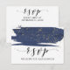Cette carte de demande de chanson à l'aquarelle marine et or est parfaite pour un mariage élégant. Ce design abstrait de nuit étoilée présente un pinceau dramatique d'aquarelle bleue marine surmonté d'un magnifique faux glitter doré. Créez votre liste d'invités de mariage et votre liste de chansons de piste de danse en même temps ! Cette carte de réponse de mariage demande commodément aux invités s'ils pourront assister à votre mariage, et quelle chanson les fera danser.