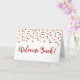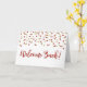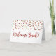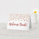 Carte de retour de bienvenue avec motif de confetti rouge et or. Parfait pour accueillir les employés au travail.