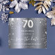 Une élégante carte de sauvegarde de date pour une fête d'anniversaire de 70 ans. Un fond métallisé argenté faux moderne, orné de fausse poussière de paillettes. Personnalisez et ajoutez une date et un nom/âge. Le texte : Sauvegarder la date est écrit avec un grand style de lettrage manuscrit à la mode. Numéro 70 avec une police de caractères en forme de ballon.