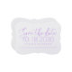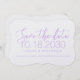 Carte de sauvegarde de date simple, minimale, simple sans photo dans une forme élégante et fantaisiste entre parenthèses en lilas lavande orchidée violet et blanc avec une typographie de script élégante et de grands nombres de date dans une police sans empattement chic. Personnalisez le modèle en sélectionnant les couleurs et les polices que vous souhaitez pour vos faire-part de mariage.