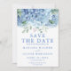 Carte d'annonce de sauvegarde de date de mariage floral aquarelle avec hydrangees pervenche bleues. Personnalisez les noms, les dates et les informations.