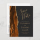 Cette élégante carte de sauvegarde de date moderne présente une bordure d'agate à l'aquarelle orange brûlé et rouille, rehaussée de paillettes dorées fausses. Personnalisez facilement le texte doré sur un fond noir décalé. Au verso, modifiez l'adresse de retour personnalisable et entrez l'URL de votre site web de mariage pour générer un code QR que vos invités peuvent scanner pour en savoir plus sur votre événement à venir.