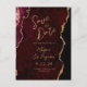 Cette élégante carte de sauvegarde de date moderne présente un fond d'agate aquarelle bourgogne taillé avec une fausse étincelle d'or. Personnalisez facilement l'écriture moderne couleur or et le texte sans serif sur le devant. Au verso, modifiez l'adresse de retour personnalisable et entrez l'URL de votre site web de mariage pour générer un code QR que vos invités peuvent scanner pour en savoir plus sur votre événement à venir.