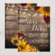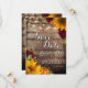 Carte de sauvegarde de date rustique de citrouille d'automne. Annoncez vos fiançailles avec style avec notre carte d'annonce de mariage rustique. Caractéristiques d'un fond en bois marron avec de la verdure répartie partout, ainsi que des tournesols jaunes, des citrouilles et des roses bordeaux.