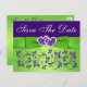 Cette carte de sauvegarde florale verte lime et violette romantique comporte un ruban et un nœud IMPRIMÉS avec une paire de bijoux en diamant IMPRIMÉS et des cœurs joints en FAUX brillant (simulé) qui correspondent à l'invitation de mariage ci-dessous. Si vous avez besoin d'autres articles assortis, veuillez envoyer un courriel à niteowlstudio@gmail.com avec votre demande.