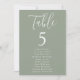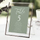 Tableau des sièges mariages moderne avec "Table" affiché dans un script blanc avec le numéro de table et les noms d'invités indiqués ci-dessous sur un arrière - plan vert sage. Le dessin se répète à l'arrière. Pour commander le tableau des sièges du numéro de table, modifiez chaque carte avec le numéro de table et les noms des invités et ajoutez-la à votre panier. Conçu pour coordonner avec notre collection Simple Script mariage.