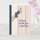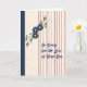 Carte de sympathie pour perte de fils. Le design est des rayures bronzées sur le côté droit où l'écriture est dans un bleu foncé. Sur le côté gauche se trouvent des fleurs bleues illustrées, des feuilles et une bordure bleu foncé. Merci à hungryjpeg pour certains des éléments du design.