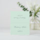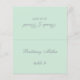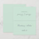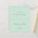 Une simple carte de table de mariage vert menthe avec le nom de l'invité et le numéro de table imprimés sur le devant et les noms des mariés et la date du mariage imprimés sur l'autre côté (c'est-à-dire l'autre moitié, avant de la plier). Tout le texte est en écriture calligraphique grise.