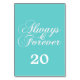 Carte de numéro de table Toujours et Forever Mariage, tendance et élégante, avec un magnifique texte de typographie manuscrit en blanc. Cette carte de table simple et élégante donne le ton à un mariage de classe et romantique et est facile à customiser avec le(s) numéro(s) de table approprié(s). Cliquez sur "Customiser" pour trouver d'autres options de personnalisation. La couleur Arrière - plan peut être changée en n'importe quelle couleur.