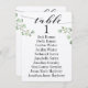 Écriture de calligraphie noire avec police à flourishes sur du papier blanc croquant avec des brins d'eucalyptus vert, cartes de tableau avec les noms des places pour dix personnes.