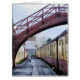 Un design artistique d'un train à vapeur et de chariots rouges et jaunes qui attendent à la gare.