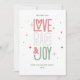 Une carte de vacances simple et amusante avec la phrase, Amour, Paix et Joie.