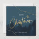 Un beau et luxueux décor paysager d'arbres de Noël avec des éléments de lignes dorées, et des enneigements. Sur un bleu foncé couleur d'eau art paysage design avec de nombreux pins. Noël en typographie dorée, petits flocons de neige dorés et éclaboussures de peinture. Avec des lignes dorées modernes gracieuses sur un arrière - plan bleu-vert foncé avec des silhouettes de pins. Design de carte de Noël de luxe par Luckz.