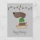 Illustration fantaisiste de chien moderne avec pull coloré sur traîneau, une chaîne de lumières de vacances et texte personnalisable "Happy Holidays"