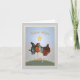 Quatre jeunes poulets perché sur le mot JOIE avec une étoile brillante de Noël au-dessus et le texte Paix-Espoir flottant dans un ciel bleu lumineux. Les poules de jardin qui sont élevées avec amour pour fournir des œufs biologiques en liberté dans une pose charmante, se blottissant étroitement, joyeuses fêtes à vous !