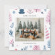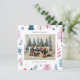 Carte de vacances avec des illustrations d'arbres de Noël mignons dans une palette de couleurs pastel, une photo de famille associée à un vœu de vacances et votre nom et année dans une police sans empattement.