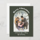 Montrez votre photo préférée avec ces cartes de fin de année plats simples et faciles à customiser. Votre photo verticale ou portrait orientée apparaît dans une belle forme d'arc avec votre titre ci-dessus en lettres blanches et vos noms ou autres textes personnalisés ci-dessous en lettres de script blanc assorties. Le texte et la photo sont placés contre un arrière - plan vert olive foncé.