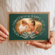 Joyeux Noël et Bonne Année ! Une carte de vacances élégante avec un design arc de Noël en feuille de bronze. Ce carte photo ovale a un motif à rayures vert festif assorti sur le dos.