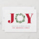 Doté d'un design JOIE moderne avec couronne verte et personnalisé avec votre accueil et nom de vacances. Une carte de vacances moderne mais chaleureuse pour la famille et les amis. Le dos de la carte a des flocons blancs contre un arrière - plan rouge assorti.