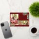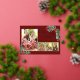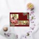 Carte festive Joyeux Noël avec des espaces pour 4 photos. Les cadres photo marron et vert laissent les images ressortir sur le fond marron rouge. 2 coins ont de la verdure avec des baies rouges pour ajouter au design festif. La police en feuille d'aluminium ajoute de la classe et donne à la carte une touche bien arrondie.