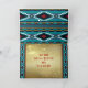 Personnalisez cette carte de Noël Kokopelli du Sud-Ouest "unique" ! Elle présente un Kokopelli du Sud-Ouest turquoise jouant de la flûte avec des notes de musique sur un fond de Noël doré et des étoiles, entouré de bordures turquoise, rouille et noires et les mots édifiants... "Paix sur Terre" !
