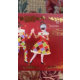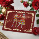 Deux danseurs de l'harlequin debonair se produisent gracieusement en costumes vibrants sur fond de régal rouge canneberge, orné de guirlandes dorées décoratives et entouré de délicates notes musicales. Illustration originale de Noël Snow.