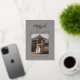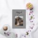 Un design moderne et élégant avec "Marié & Joyeux" en polices de calligraphie avec feuille d'or. La couleur arrière - plan est gris. Le nom du couple est aussi en feuille d'or sous la photo. Le côté arrière a une autre photo et un message customisé dans un or clair - couleur seulement (il n'y a pas de feuille sur le côté arrière). Les polices et les couleurs sont personnalisables.