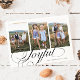 Modèle de carte de voeux minimaliste et moderne comprenant 3 photos avec un texte manuscrit qui dit "joyeux" en bas. Vous pouvez également ajouter une autre image et un message au verso.