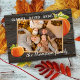 Unique, classe, tendance, jolie et décorative carte de vacances Thanksgiving. Joli don béni Merci texte et espace pour customiser ou personnaliser avec une photo et les noms (ou nom de famille) de votre choix. Avec de mignons citrouilles oranges classiques sur un look patiné gris rustique maison de ferme inspirée de planches de bois de barnwood design arrière - plan motif. Et une saison personnalisable saluant poème sur le dos de la carte.