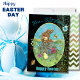Cette jolie carte de vacances de Pâques présente un très mignon lapin de l'Est tenant un petit poussin sur un fond sombre entouré d'une prairie avec beaucoup de fleurs sauvages colorées et un autre poussin qui erre à travers et des abeilles bourdonnes qui volent autour.