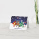 Joli Noël Joyeux et Bonne nouvelle année carte de voeux avec cadeau rouge et ruban or et arc, rennes heureux, arbre avec lumières et lolipop sur le ciel bleu foncé avec des lettres lolipop.