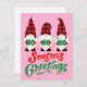 Carte de voeux de vacances avec 3 gnomes et lettrage de voeux de saison sur fond rose. Fait une carte parfaite pour vos proches.