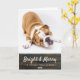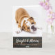 Carte de vacances Rustic Dark Wood Christmas Chien photo. La carte a un arrière - plan rustique en bois foncé avec de petits flocons blancs. Ajoutez votre photo et customisez le message à l'avant et à l'intérieur.