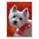 Ce petit chiot Westie pose fièrement, arborant un joyeux arc de flocon rouge et blanc pour vous mettre dans l'esprit de la saison.