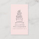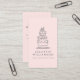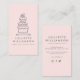 Une carte de visite moderne, professionnelle et propre pour les pâtissiers et les adeptes du dessert. Cette conception présente une image dessinée à la main fantaisie d'un gâteau à trois niveaux en blanc et des détails d'affaires en gris foncé, contre un arrière - plan rose pâle. Le verso de la carte a un arrière - plan rose vif et vos coordonnées et icônes de médias sociaux (également amovible en cliquant sur "personnaliser") en gris.