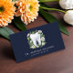 Carte de visite dentiste moderne et élégant, avec un logo aquarelle avec une dent nichée à l'intérieur d'une belle couronne fleurie ornée de fines fleurs blanches et de feuillage vert. Le devant présente deux lignes de texte pour votre nom et votre titre. Personnalisez le dos avec votre monogramme initial unique, les coordonnées, les poignées de médias sociaux et un code QR. Ce design exquis est parfait pour tout professionnel dentaire qui cherche à faire une impression remarquable.