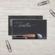 Un carte de visite maquilleur moderne chic et minimaliste, avec une typographie en écriture blanche sur un arrière - plan noir gris fusain, et des outils maquilleurs de la profession sur un arrière - plan noir. Code QR et médias sociaux sur un arrière - plan noir au charbon de bois en détresse au dos de la carte. Un style simple et chic.
