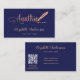 Un élégant carte de visite sur un arrière - plan bleu marine et un stylo en plumes d'or rose. Élégant script de style écrit à la main. Personnalisez et ajoutez Votre nom, titre, coordonnées et votre propre code QR à votre adresse de site Web.