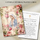 Remember your loved ones in prayer with this beautiful personalized traditional Catholic religious memorial holy card of the Blessed Virgin Mary praying accented with soft pastel pink colored roses and a vintage background.