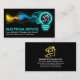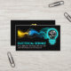 Une couverture entièrement noire est munie d'un éclair électrique qui alimente une ampoule qui contient un "filament-lettre". ; La lettre-e peut représenter votre nom prestigieux, votre nom commercial, etc. Près de la base se trouve le nom de l'entreprise dans cyan lumineux et ses coordonnées. En haut se trouve le logo lettre-e dorée que vous pouvez utiliser, suivi de votre nom prestigieux, des coordonnées et d'une option de légende de slogan que vous pouvez modifier pour répondre à vos propres besoins de service. C'est une carte créative faite pour les électriciens. #électricien #électricité #entrepreneur électrique #réparations électriques #électricité #ingénieur électrique #éclairage #bulbe #plug #zazzlemade
