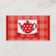 Teapot à pois rouge illustré encadré en plaid avec étiquette de bannière rouge en dessous pour afficher votre nom d'entreprise. Ces cartes de visite à double face sont parfaits pour les cafés mignons et accueillants, les cuisines de campagne, les commerces ou l'hospitalité. Image et nom commercial sur l'avant et détails d'affaires sur l'envers. Customisez pour répondre à vos besoins.