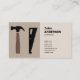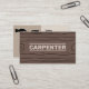 Un Carte de visite avec le texte Carpenter écrit sur un arrière - plan en bois. Le dos est livré avec toutes les informations personnalisables et, à gauche, une illustration d'un marteau et d'une scie, le tout dans les tons beiges. Parfait pour les professionnels du travail du bois tels que menuisier, ébéniste, construction en bois, etc.