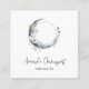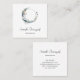 carte de visite carré avec une illustration mystique. Une lune bleu foncé avec un contour élégant en cercle mince et des fleurs blanches fleurissent le long de ses bords.